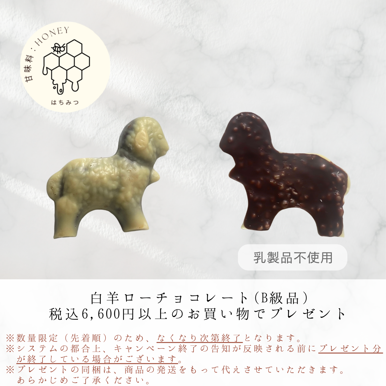 この度、ECサイトにて税込6,600円以上ご購入いただいた方を対象に、「白羊 ローチョコレート」のB級品(試食用)のプレゼントキャンペーンを実施いたします。